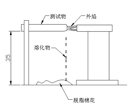 4. 測試距離約離脫脂棉花35CM高度 測試標準:用火點燃所測試的物體(高約等於35CM),其熔化物滴到脫脂棉花上,棉花不燃燒,說明所測試物體阻燃性為94V-0.
